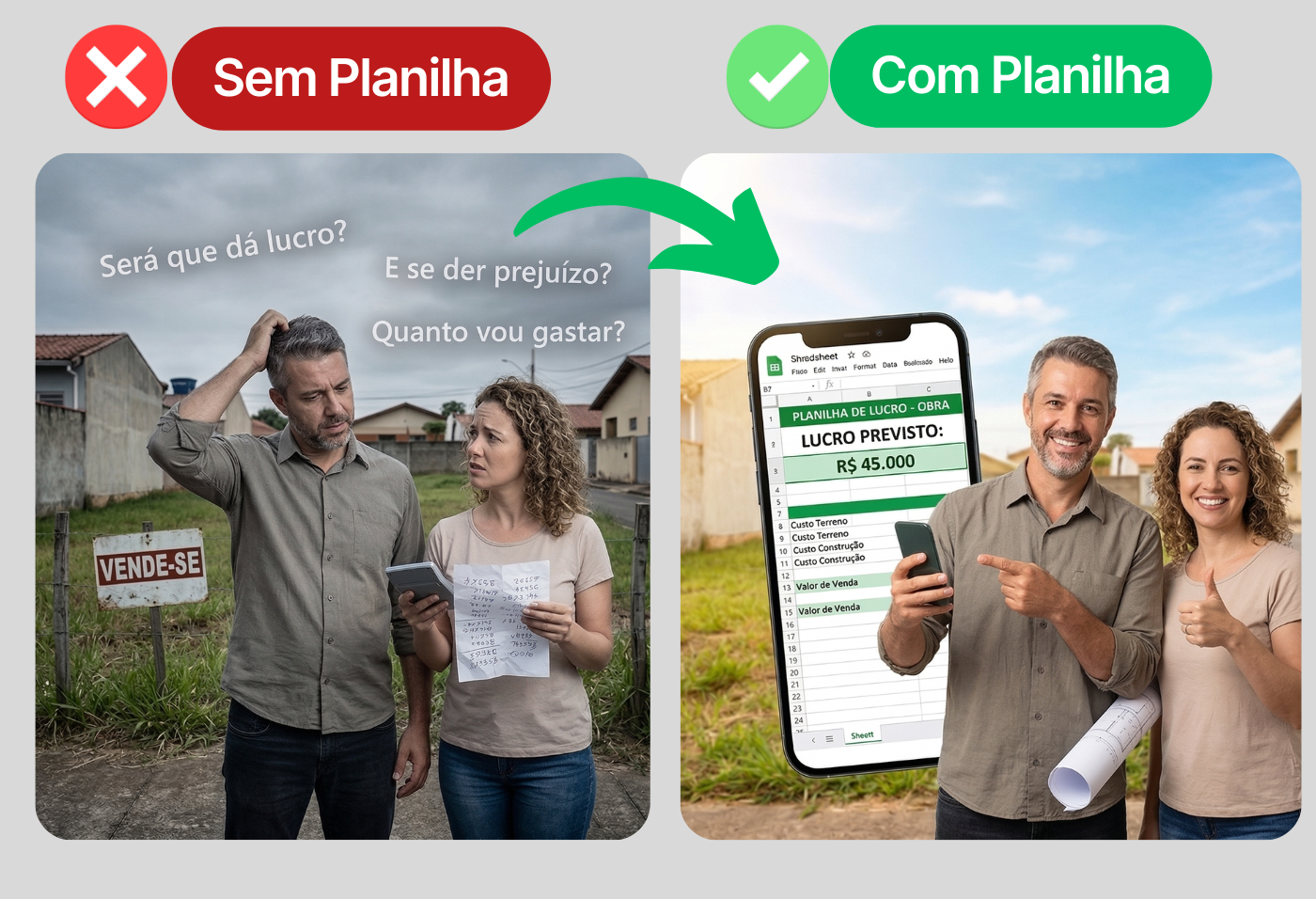 Foi feita exatamente pra isso. A planilha te dá clareza do lucro ANTES de gastar um centavo, mesmo que seja sua primeira obra.
